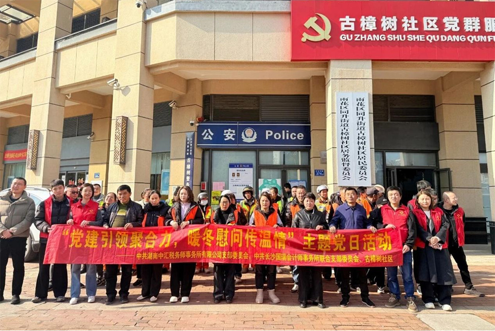 为深入贯彻党建共建共联理念,充分发挥基层党组织战斗堡垒作用与党员先锋模范作用。2月2日下午,湖南中汇税务师事务所党支部联合长沙市雨花区同升街道古樟树社区委员会,在古樟社区前坪广场开展 “党建引领聚合力,暖冬慰问传温情”主题党日活动,约50 名党员志愿者与环卫工人代表齐聚现场,共同谱写冬日暖心篇章。