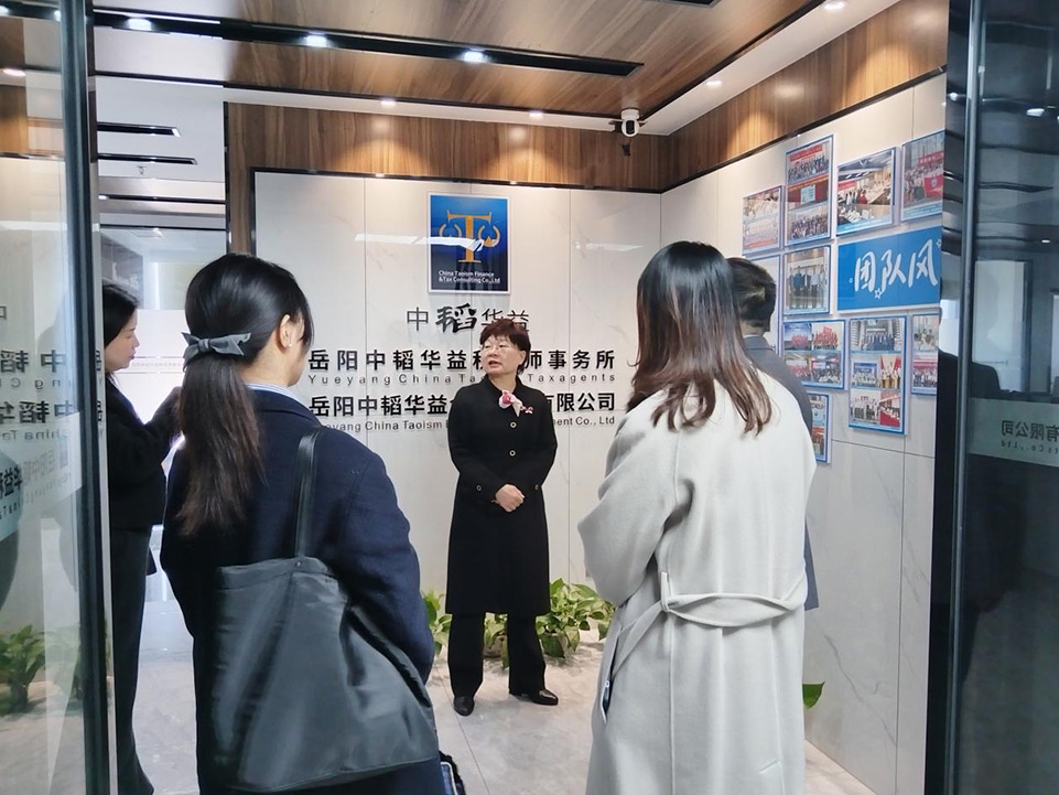 在调研过程中,彭爱华一行到“惠企学税工作站”进行了参观,详细了解工作站自运营以来的工作成绩以及服务效果。通过工作汇报、观看中韬华益集团宣传片,全面了解中韬华益自成立以来在企业文化、集团发展、人才培养、事务所治理、行业赋能等方面所取得的工作成绩。岳阳中韬华益总经理张英,在座谈会上重点汇报在政治参与、社会公益、为税务师行业发展建言献策等方面所做的努力和成效。